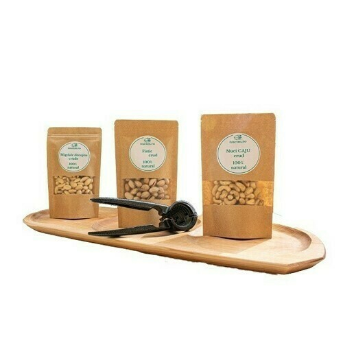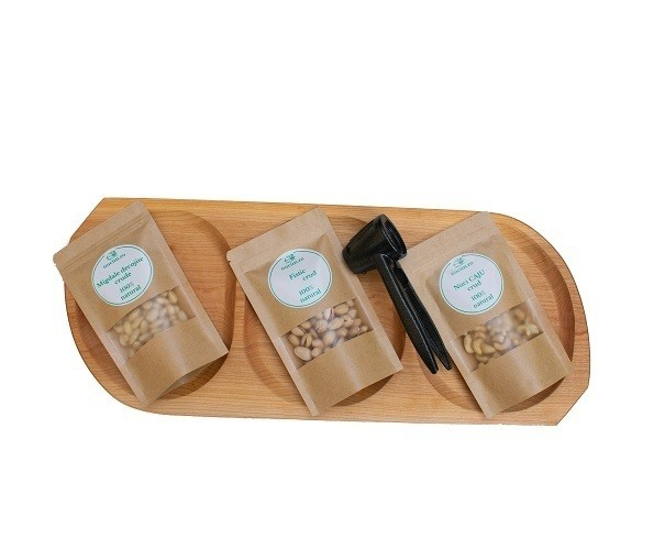 1. Platou servire aperitiv cu 3 compartimente, nuci, alune, traditional din lemn sculptat, lacuit