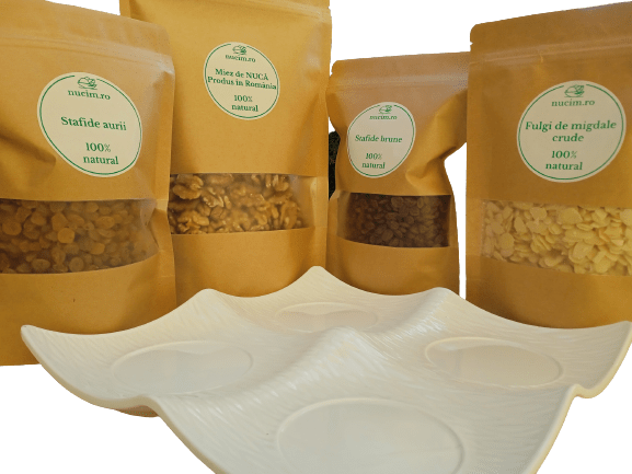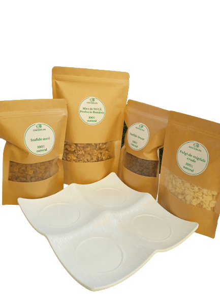 1. Platou servire aperitiv, cozonac, pasca, nuci, alune, cu 4 compartimente, portelan